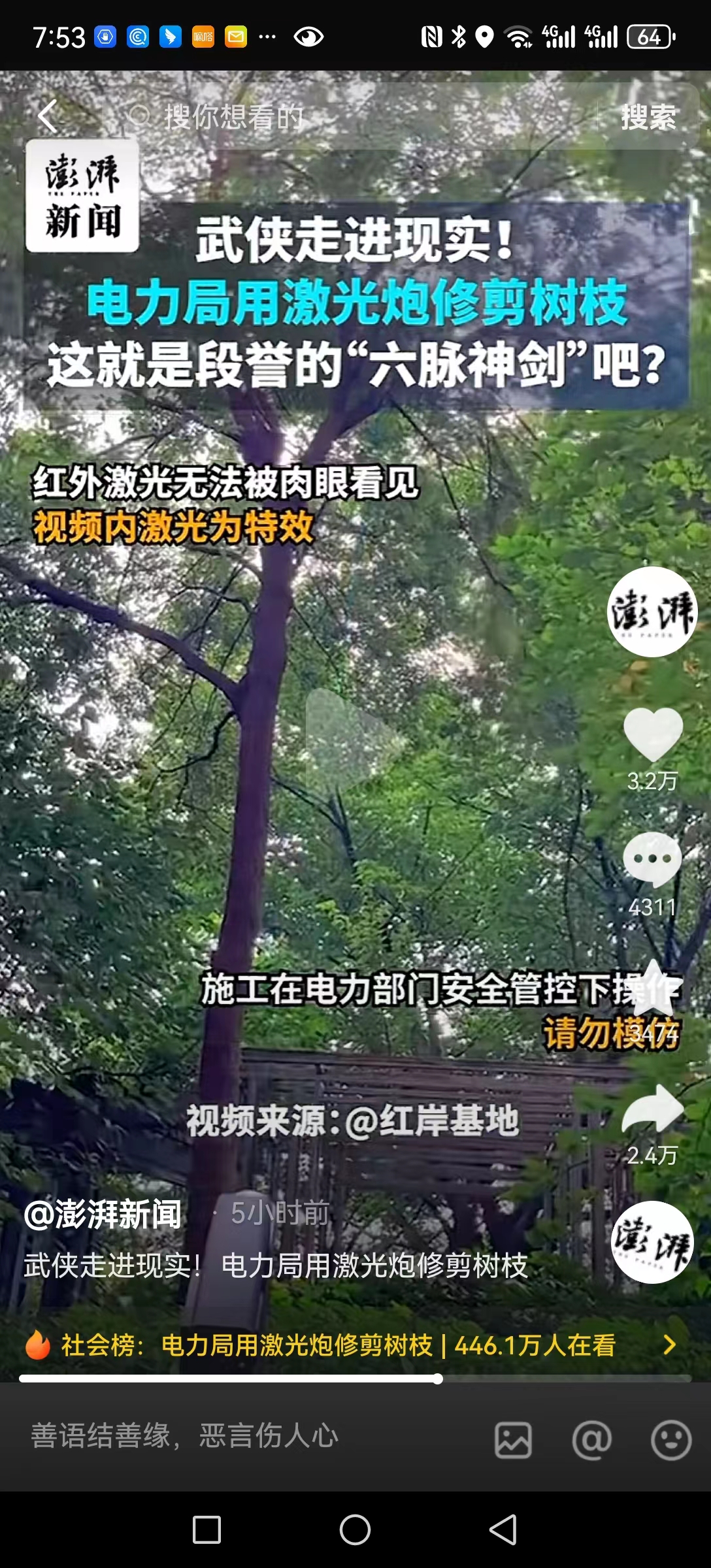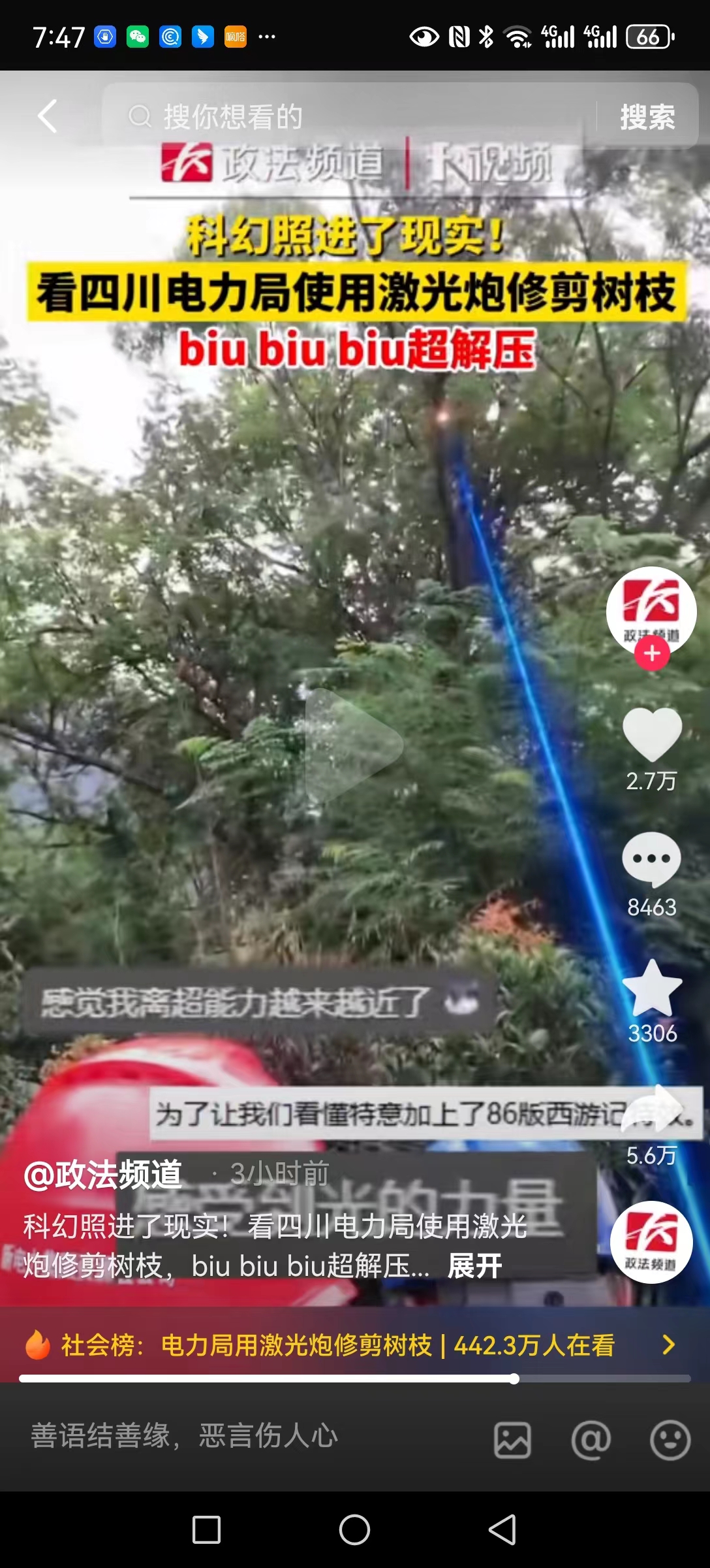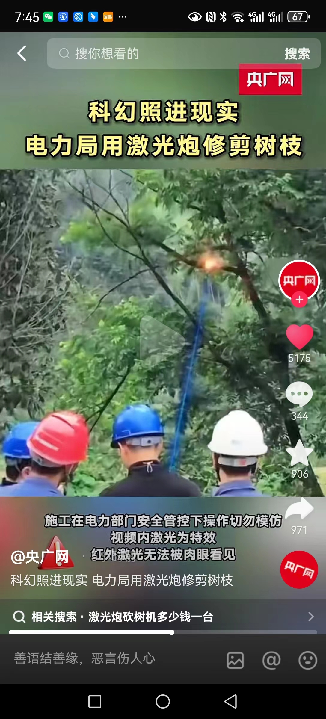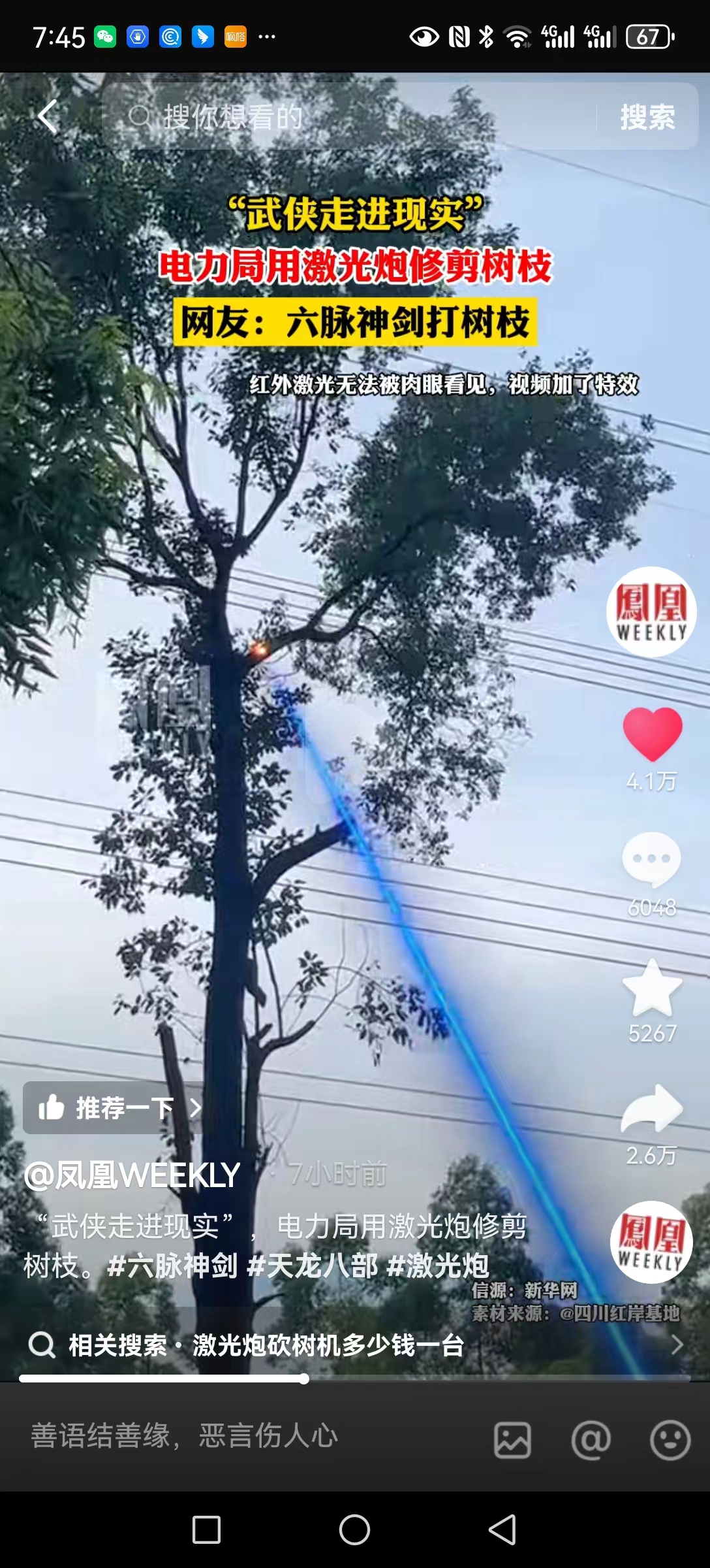 20231225,我司生产的激光清障仪在一次电力安全事件用激光清障仪处理树障的短视频在抖音上引发热议,被网友戏称为六脉神剑,并与《天龙八部》和《西游记》等经典电视剧联系起来。引发了各大网络平台的关注和转载。